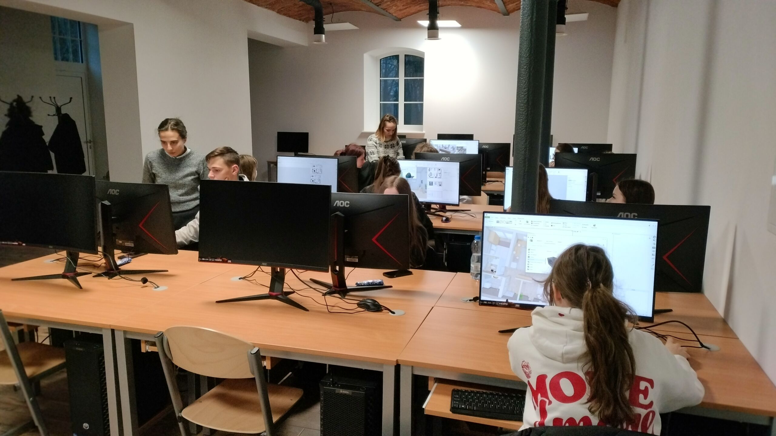 W trakcie zajęć młodzież poznawała podstawy ergonomii i funkcjonalnego planowania przestrzeni, wykonywała inwentaryzację pomieszczeń, a następnie tworzyła dokumentację 2D w AutoCAD. Kolejnym etapem było modelowanie i aranżacja wnętrz w środowisku 3D w pCon Planner, z pracą nad materiałami, teksturami, oświetleniem i próbami renderów. Ważnym elementem kursu był także dobór materiałów wykończeniowych. Nie zabrakło też moodboardów i rozmów o tym, jak łączyć estetykę z realnymi możliwościami wykonawczymi.