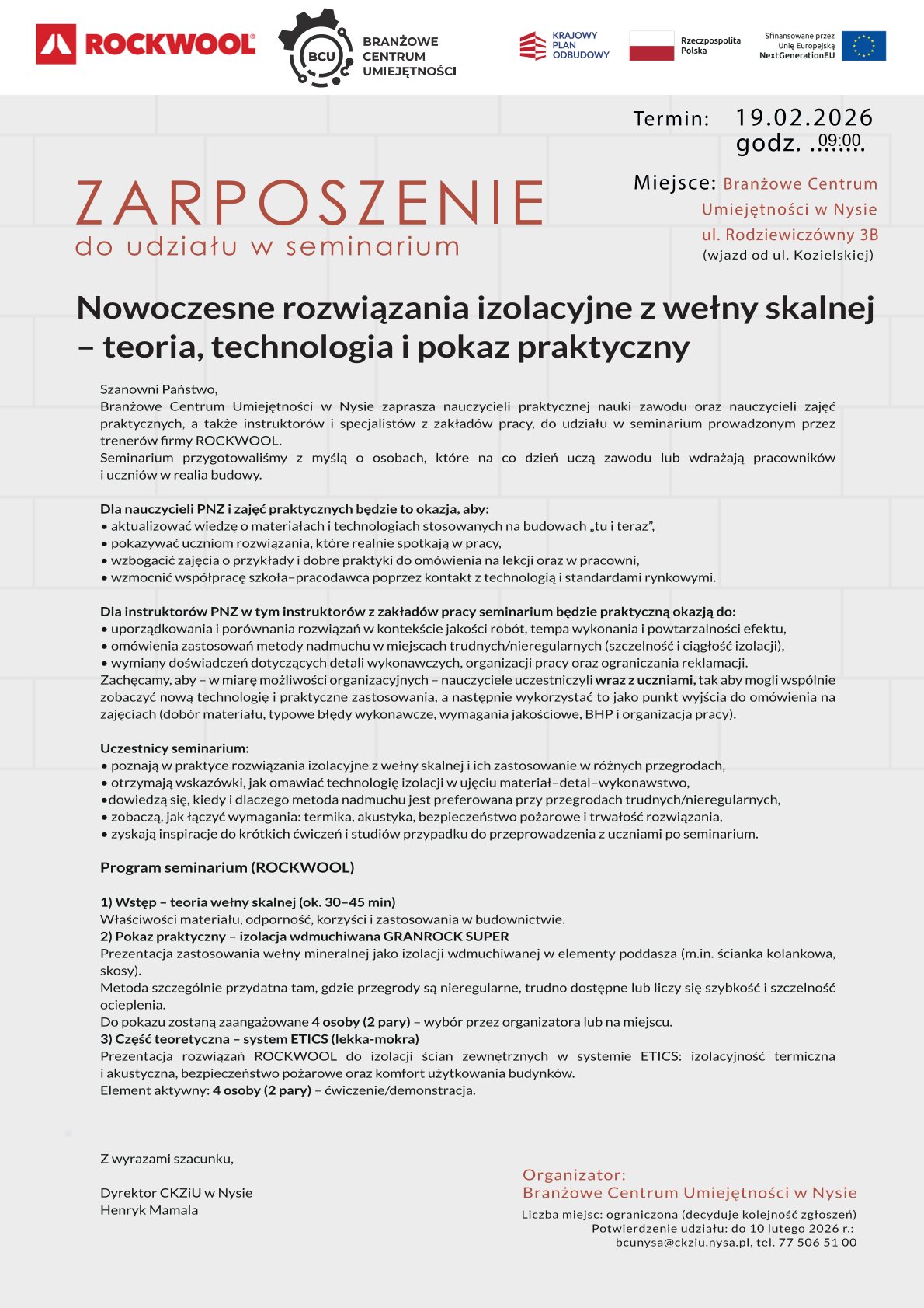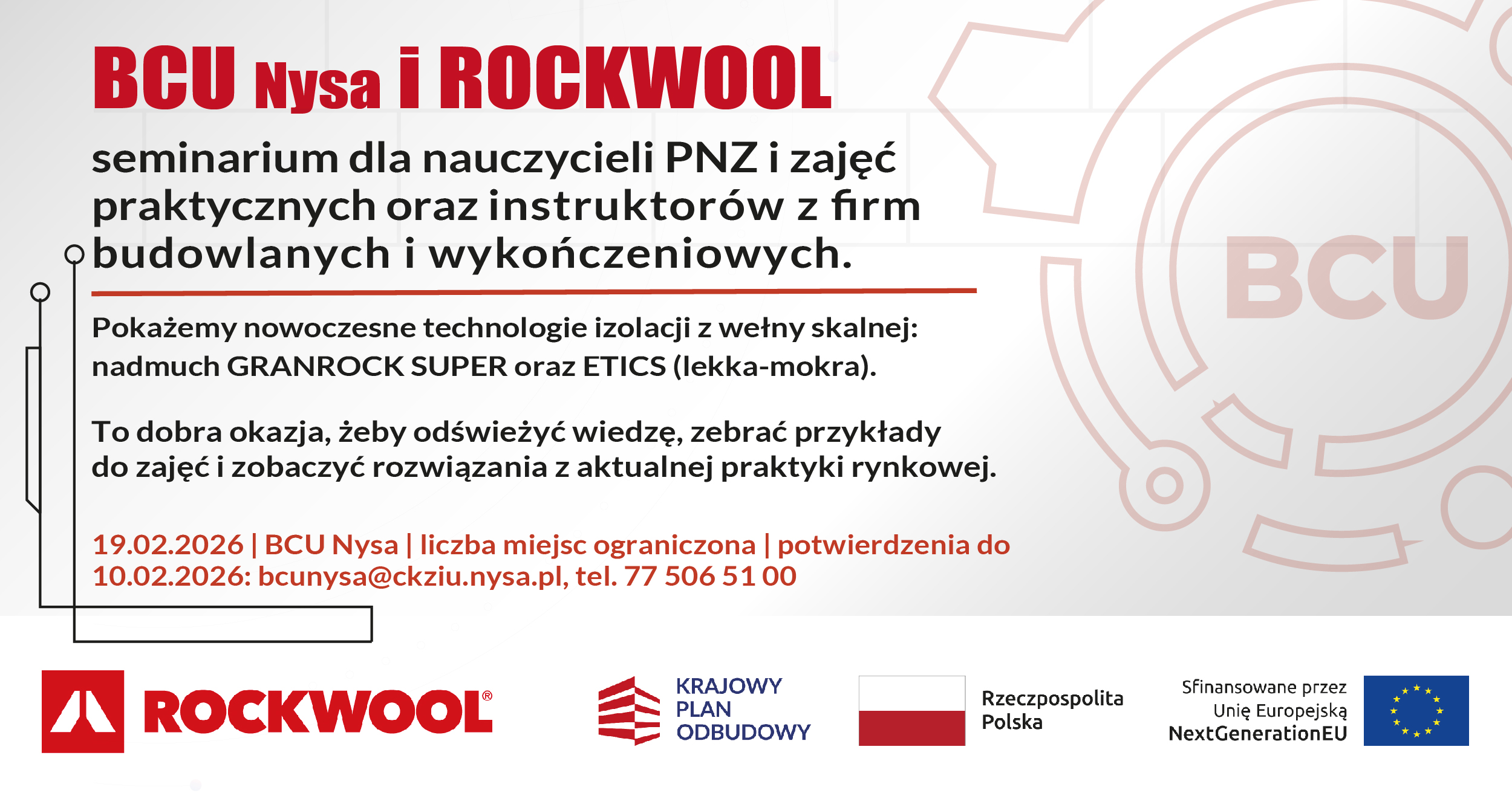 BCU w Nysie zaprasza do udziału w seminarium "Nowoczesne rozwiązania izolacyjne z wełny skalnej – teoria, technologia i pokaz praktyczny"