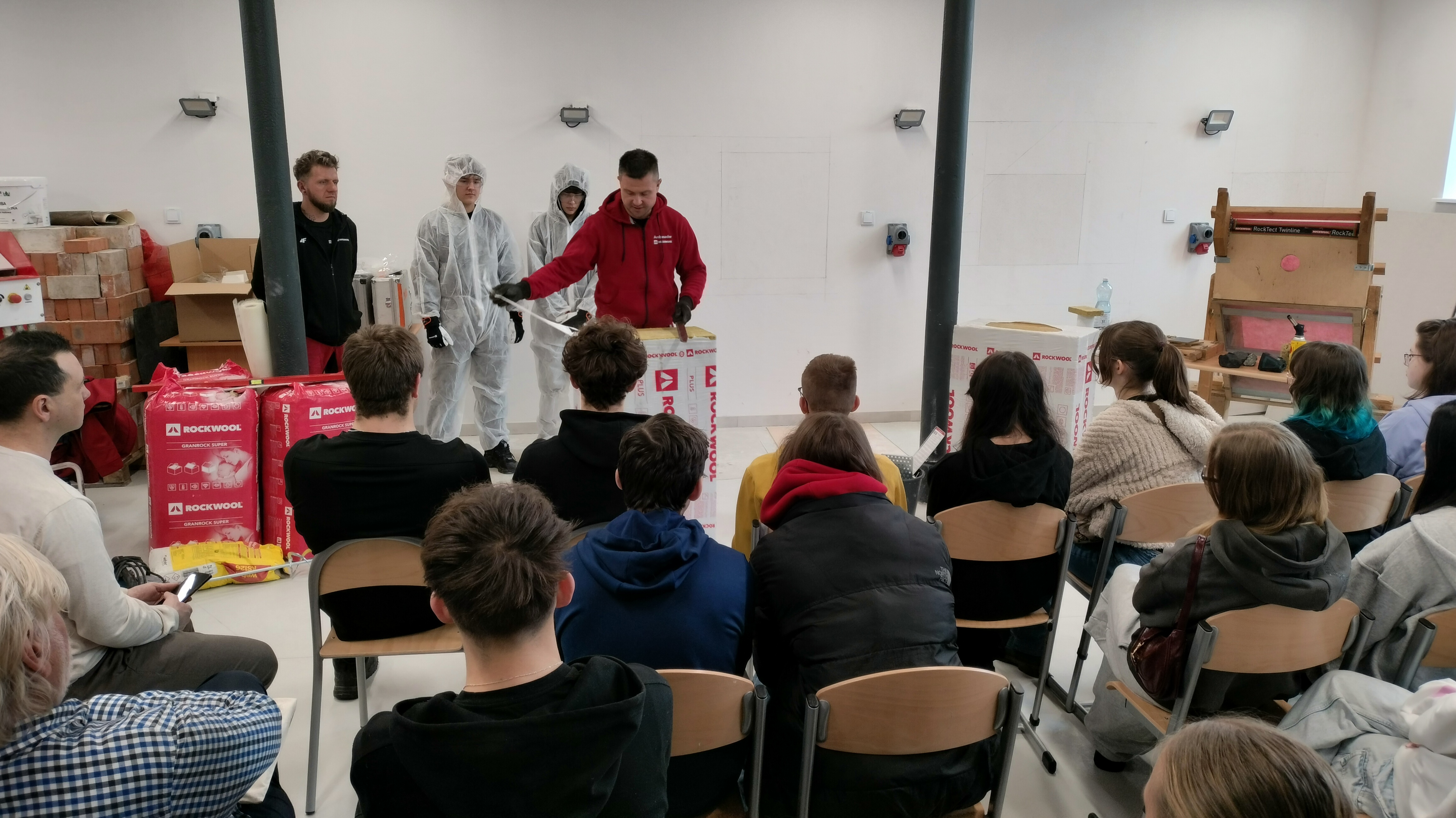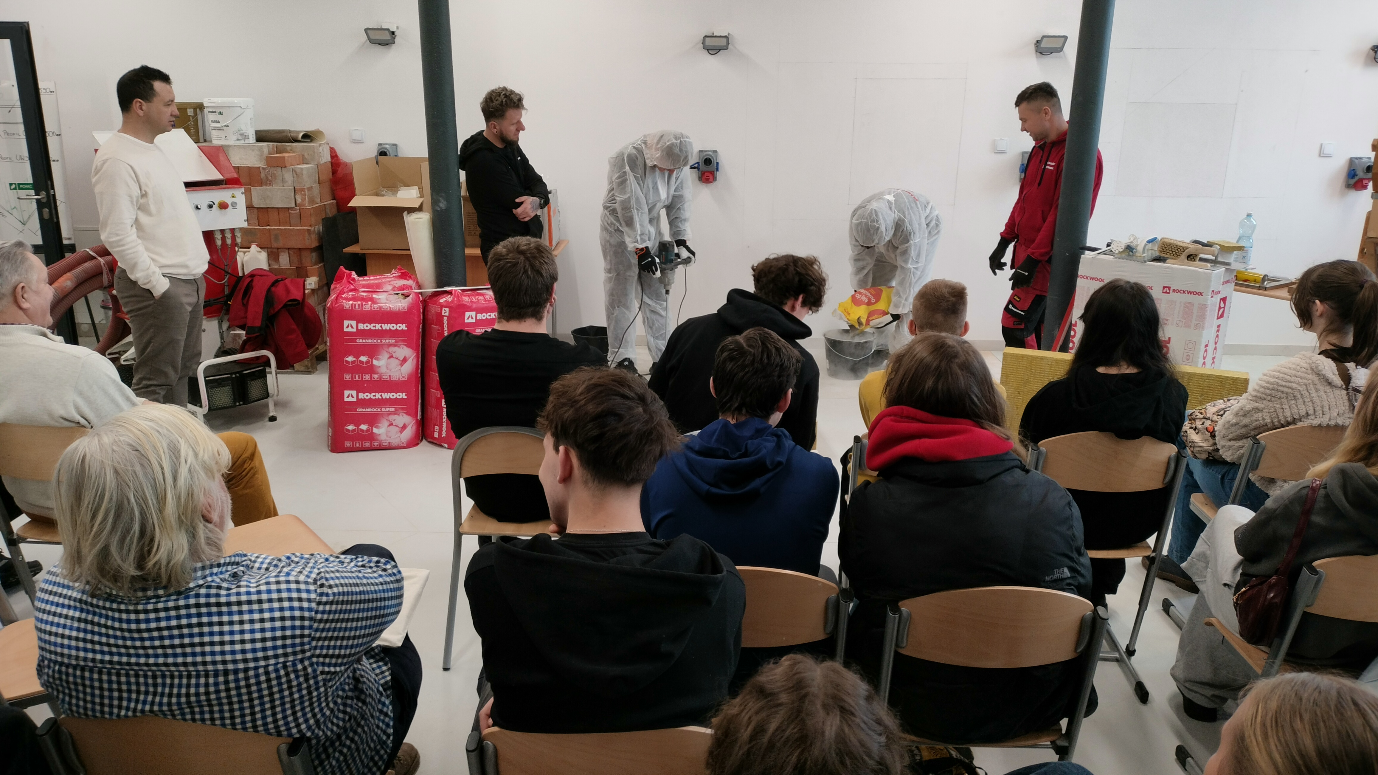 Tematyka seminarium obejmowała nowoczesne rozwiązania izolacyjne z wełny skalnej – zarówno w części teoretycznej, jak i praktycznej. Uczestnicy mieli okazję zapoznać się m.in. z właściwościami materiałów izolacyjnych, technologią nadmuchu oraz rozwiązaniami systemowymi ETICS, a także zobaczyć pokaz praktyczny i omówić najczęstsze błędy wykonawcze oraz standardy jakości.
